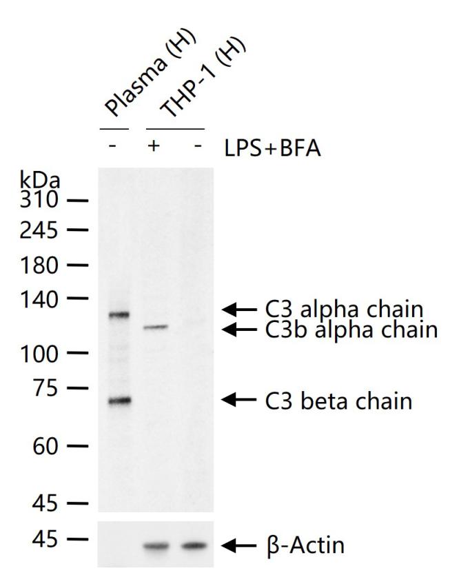 THP-1 (H) cells were treated with or without LPS (1µg/ml) and BFA (300 ng/ml) for 24 h, 25 μg total protein per lane of cell lysates (see on figure) probed with Complement C3 monoclonal antibody, unconjugated (bsm-63199R) at 1:1000 dilution and 4°C overnight incubation. Followed by conjugated secondary antibody incubation at r.t. for 60 min.