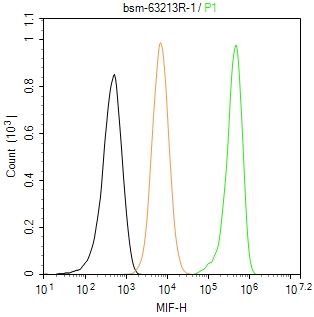 The U-87MG (H) cells were fixed with 4% PFA (10 min at r.t.) and then permeabilized with 90% ice-cold methanol for 20 min at -20℃,the cells then were incubated in 5%BSA to block non-specific protein-protein interactions (30 min at r.t.), followed by secondary antibody incubation for 40 min at room temperature. Primary Antibody (green):Rabbit Anti-MIF antibody (bsm-63213R,1:100); Isotype Control (orange): Rabbit IgG (bs-0295P). Blank control (black): PBS. Acquisition of 20,000 events was performed.