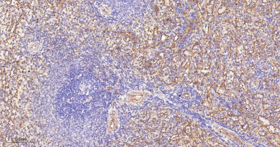 Paraformaldehyde-fixed, paraffin embedded Human Spleen; Antigen retrieval by boiling in sodium citrate buffer (pH6.0) for 15 min; The section was incubated with Fragilis Monoclonal Antibody, Unconjugated (bsm-63221R) at 1:200 overnight at 4°C, followed by conjugation to the bs-0295G-HRP and DAB (C-0010) staining.