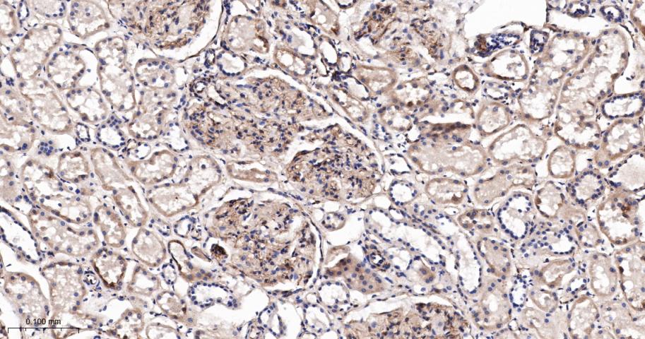 Paraformaldehyde-fixed, paraffin embedded Human Kidney; Antigen retrieval by boiling in sodium citrate buffer (pH6.0) for 15 min; The section was incubated with Fragilis Monoclonal Antibody, Unconjugated (bsm-63221R) at 1:200 overnight at 4°C, followed by conjugation to the bs-0295G-HRP and DAB (C-0010) staining.