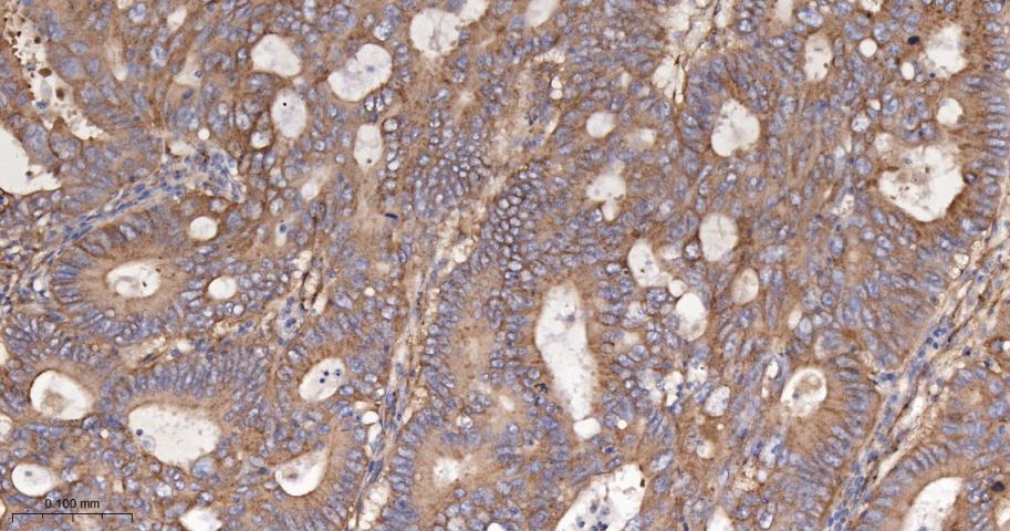 Paraformaldehyde-fixed, paraffin embedded Human Colon Cancer; Antigen retrieval by boiling in sodium citrate buffer (pH6.0) for 15 min; The section was incubated with Fragilis Monoclonal Antibody, Unconjugated (bsm-63221R) at 1:200 overnight at 4°C, followed by conjugation to the bs-0295G-HRP and DAB (C-0010) staining.