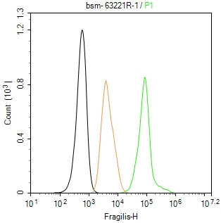 The HeLa (H) cells were fixed with 4% PFA (10 min at r.t.) and then permeabilized with 90% ice-cold methanol for 20 min at -20℃,the cells then were incubated in 5%BSA to block non-specific protein-protein interactions (30 min at r.t.), followed by secondary antibody incubation for 40 min at room temperature. Primary Antibody (green):Rabbit Anti-Fragilis antibody (bsm-63221R,1:100); Isotype Control (orange): Rabbit IgG (bs-0295P). Blank control (black): PBS. Acquisition of 20,000 events was performed.