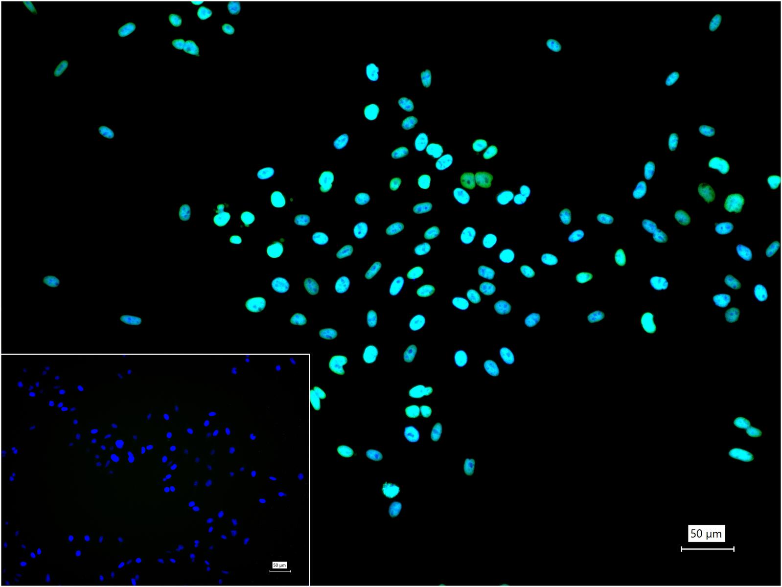 4% Paraformaldehyde-fixed HeLa (treated with Trichostatin A (TSA)(1μM, 18h)) (H) cell; Triton X-100 at r.t. for 20 min; Antibody incubation with (Acetyl-Histone H3(K37)) monoclonal Antibody, unconjugated (bsm-63228R) 1:100, 90 min at 37°C; followed by BF488 conjugated Goat Anti-Rabbit IgG antibody (green, bs-60295G-BF488) at 37°C for 90 min, DAPI (blue, C02-04002) was used to stain the cell nuclei. PBS instead of the primary antibody was used as the blank control.