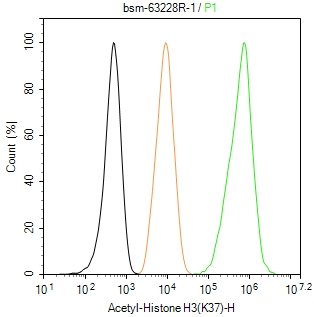 The HeLa (treated with Trichostatin A (TSA)(1μM, 18h)) (H) cells were fixed with 4% PFA (10 min at r.t.) and then permeabilized with 90% ice-cold methanol for 20 min at -20℃,the cells then were incubated in 5%BSA to block non-specific protein-protein interactions (30 min at r.t.), followed by secondary antibody incubation for 40 min at room temperature. Primary Antibody (green):Rabbit Anti-Acetyl-Histone H3(K37) antibody (bsm-63228R,1:100); Isotype Control (orange): Rabbit IgG (bs-0295P). Blank control (black): PBS. Acquisition of 20,000 events was performed.