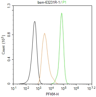 The SH-SY5Y (H) cells were fixed with 4% PFA (10 min at r.t.) and then permeabilized with 90% ice-cold methanol for 20 min at -20℃,the cells then were incubated in 5%BSA to block non-specific protein-protein interactions (30 min at r.t.), followed by secondary antibody incubation for 40 min at room temperature. Primary Antibody (green):Rabbit Anti-PFKM antibody (bsm-63231R,1:100); Isotype Control (orange): Rabbit IgG (bs-0295P). Blank control (black): PBS. Acquisition of 20,000 events was performed.