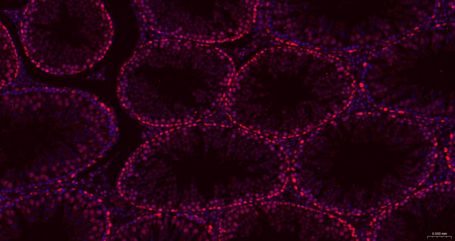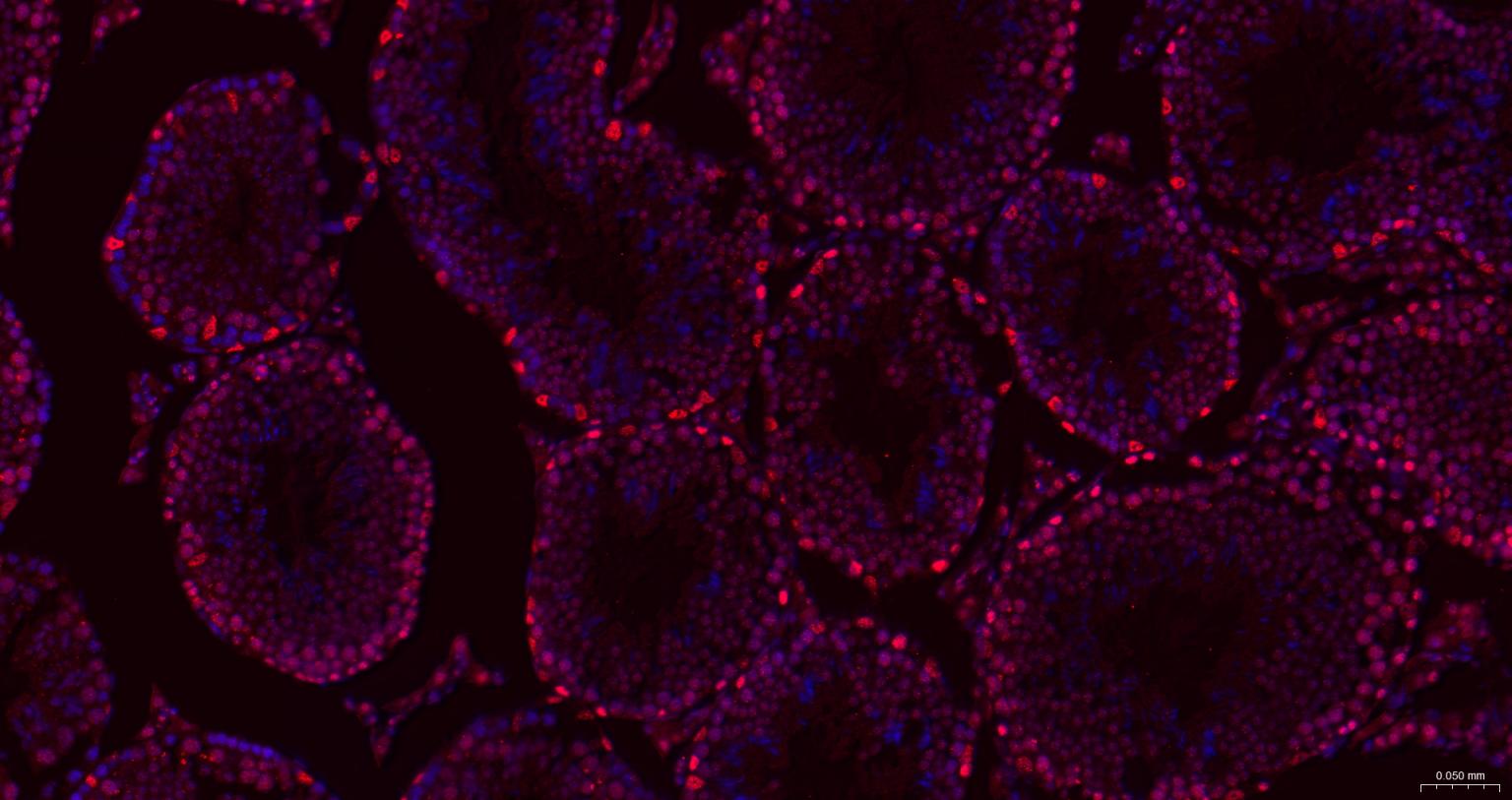 Paraformaldehyde-fixed, paraffin embedded Mouse Testicles; Antigen retrieval by boiling in sodium citrate buffer (pH6.0) for 15 min; The section was incubated with Oct-1 Monoclonal Antibody, Unconjugated (bsm-63240R) at 1:200 overnight at 4°C. Followed by conjugated Goat Anti-Rabbit IgG antibody (Red, bs-0295G-BF594), DAPI (blue, C02-04002) was used to stain the cell nuclei.