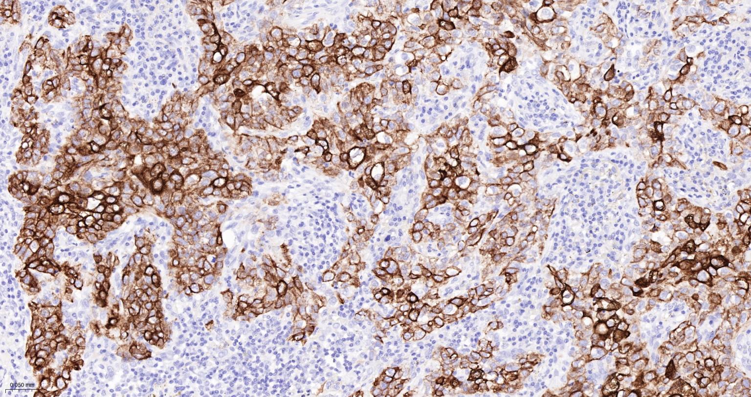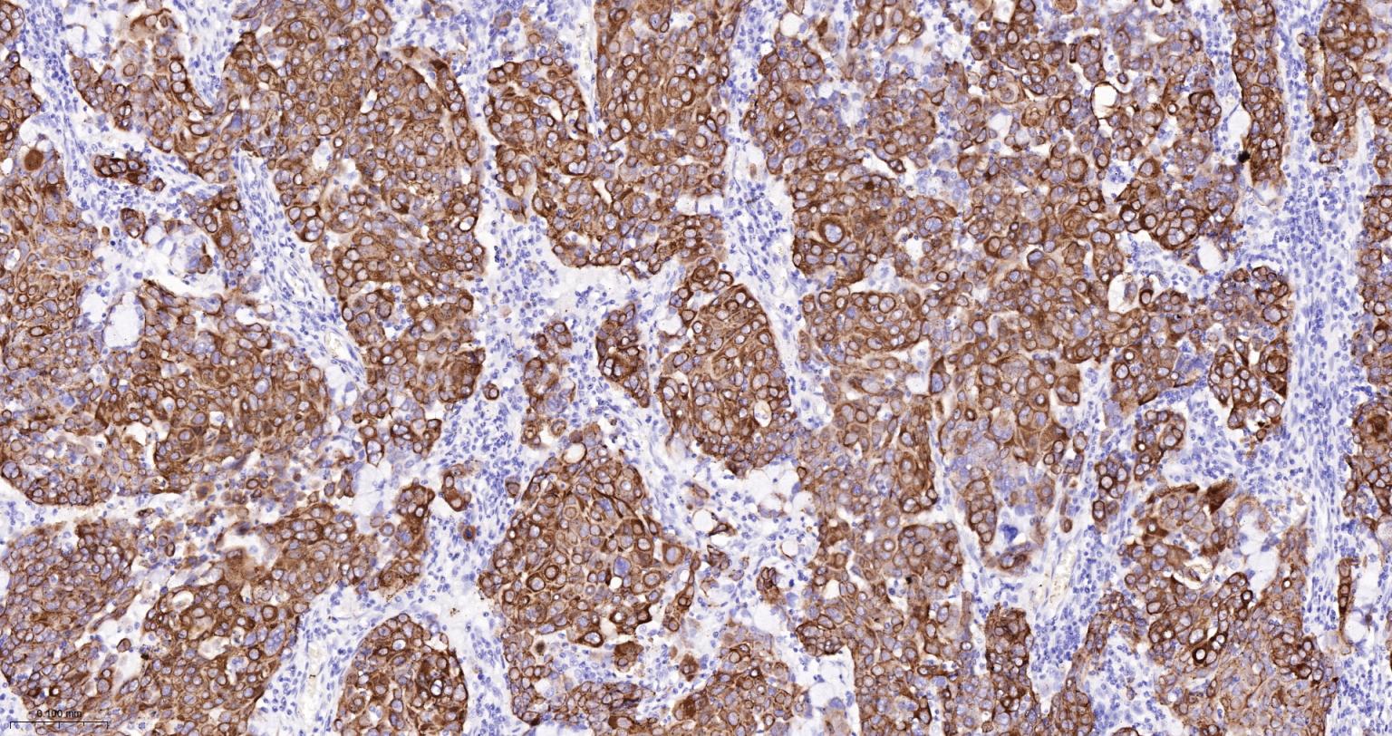 Paraformaldehyde-fixed, paraffin embedded Human Lung squamous cell carcinoma; Antigen retrieval by boiling in sodium citrate buffer (pH6.0) for 15 min; The section was incubated with Cytokeratin 6 Monoclonal Antibody, Unconjugated (bsm-63255R) at 1:200 overnight at 4°C, followed by conjugation to the bs-0295G-HRP and DAB (C-0010) staining.