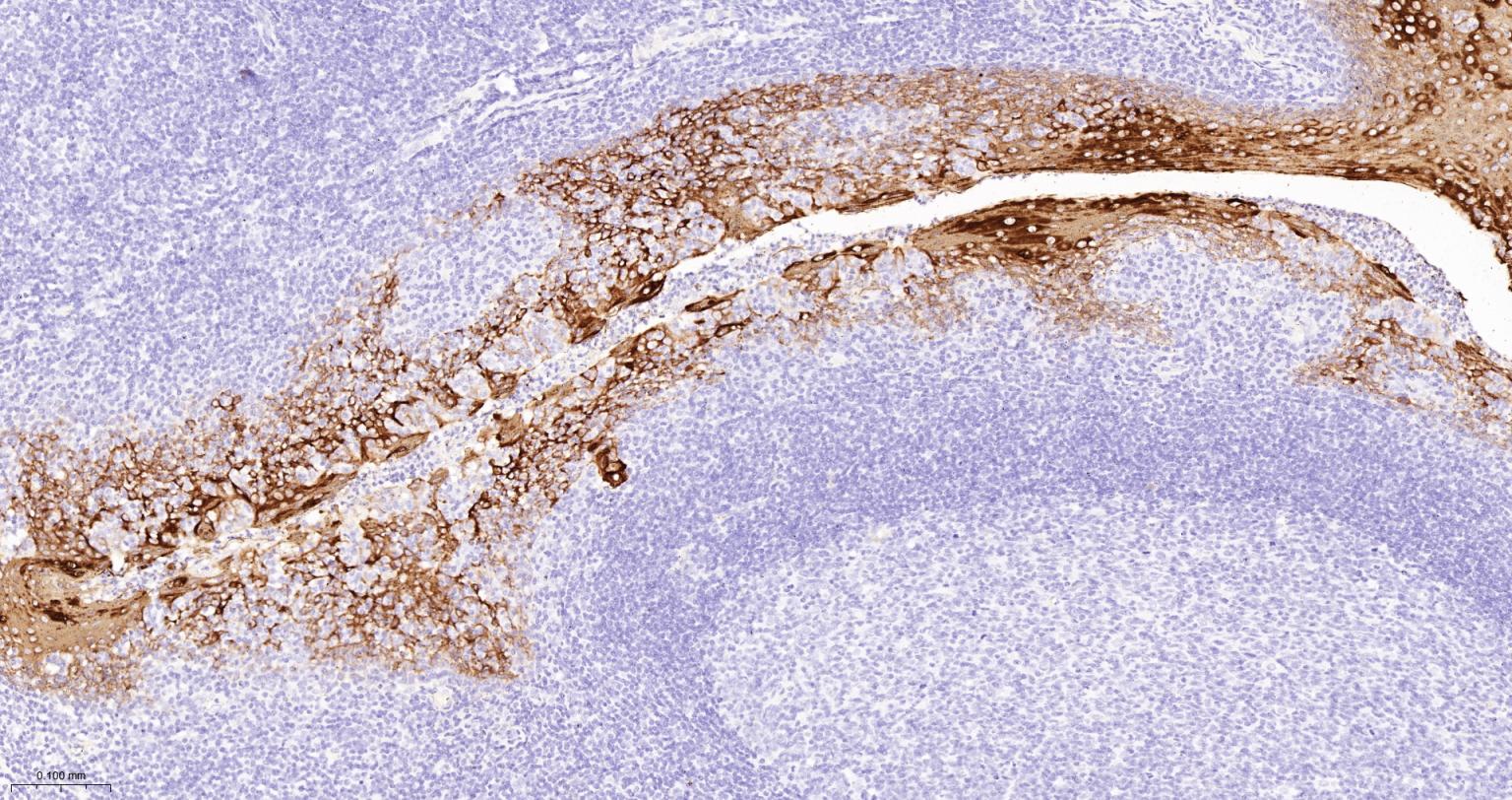 Paraformaldehyde-fixed, paraffin embedded Human Tonsil; Antigen retrieval by boiling in sodium citrate buffer (pH6.0) for 15 min; The section was incubated with Cytokeratin 6 Monoclonal Antibody, Unconjugated (bsm-63255R) at 1:200 overnight at 4°C, followed by conjugation to the bs-0295G-HRP and DAB (C-0010) staining.