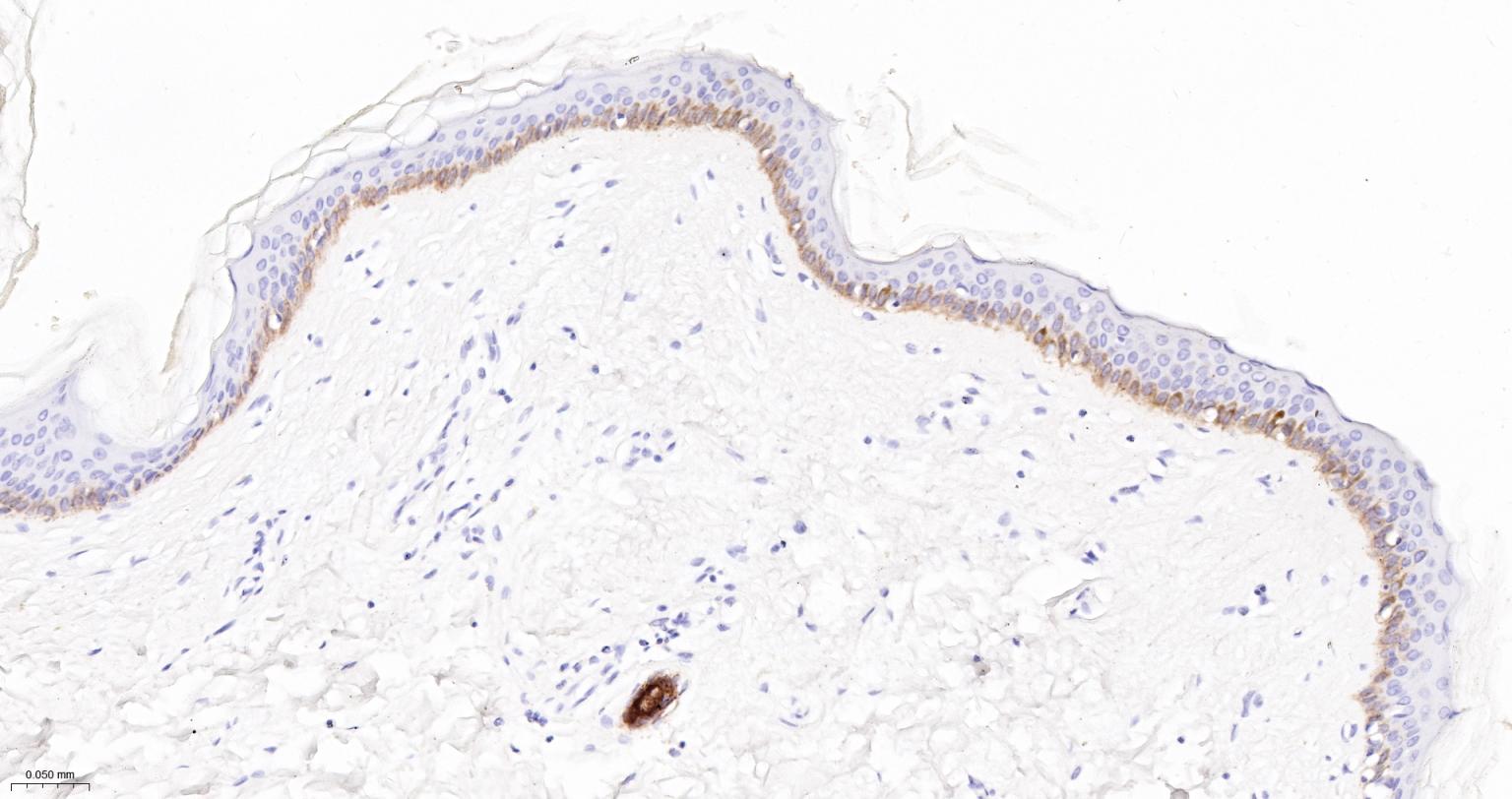 Paraformaldehyde-fixed, paraffin embedded Human abdominal skin; Antigen retrieval by boiling in sodium citrate buffer (pH6.0) for 15 min; The section was incubated with Cytokeratin 6 Monoclonal Antibody, Unconjugated (bsm-63255R) at 1:200 overnight at 4°C, followed by conjugation to the bs-0295G-HRP and DAB (C-0010) staining.