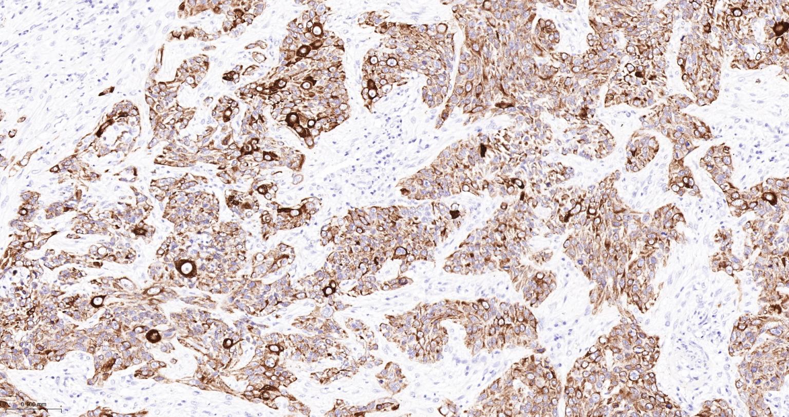 Paraformaldehyde-fixed, paraffin embedded Human Cervical Cancer; Antigen retrieval by boiling in sodium citrate buffer (pH6.0) for 15 min; The section was incubated with Cytokeratin 6 Monoclonal Antibody, Unconjugated (bsm-63255R) at 1:200 overnight at 4°C, followed by conjugation to the bs-0295G-HRP and DAB (C-0010) staining.