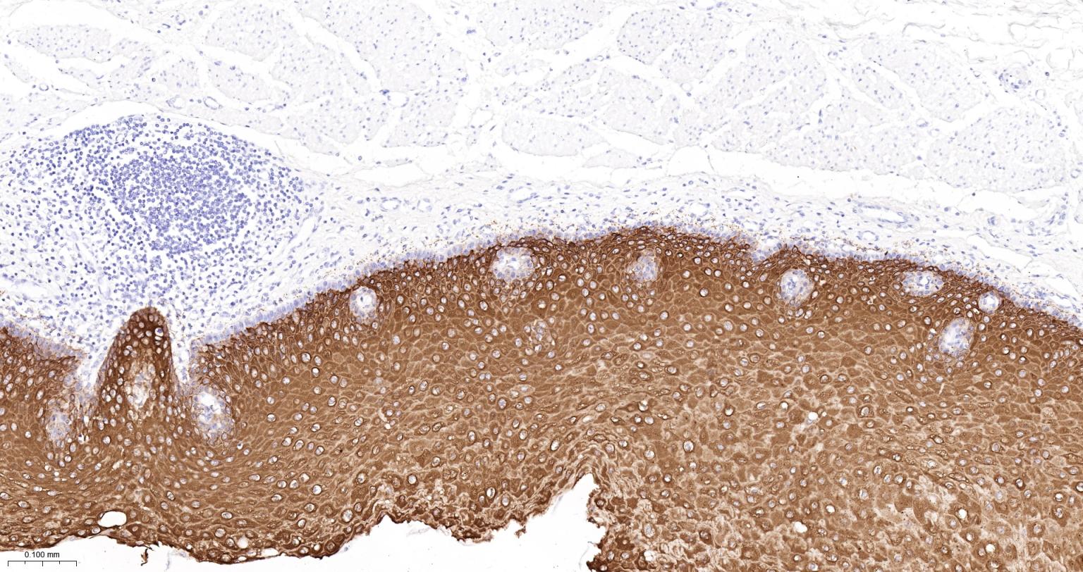 Paraformaldehyde-fixed, paraffin embedded Human Esophagus; Antigen retrieval by boiling in sodium citrate buffer (pH6.0) for 15 min; The section was incubated with Cytokeratin 6 Monoclonal Antibody, Unconjugated (bsm-63255R) at 1:200 overnight at 4°C, followed by conjugation to the bs-0295G-HRP and DAB (C-0010) staining.