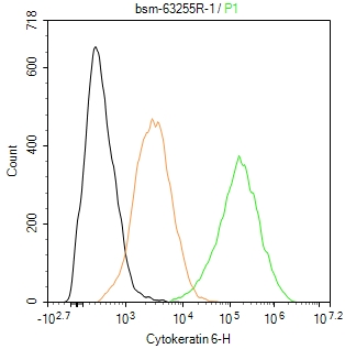 The HaCaT(H) cells were fixed with 4% PFA (10 min at r.t.) and then permeabilized with 90% ice-cold methanol for 20 min at -20℃,the cells then were incubated in 5%BSA to block non-specific protein-protein interactions (30 min at r.t.), followed by secondary antibody incubation for 40 min at room temperature. Primary Antibody (green):Rabbit Anti-Cytokeratin 6 antibody (bsm-63255R,1:100); Isotype Control (orange): Rabbit IgG (bs-0295P). Blank control (black): PBS. Acquisition of 20,000 events was performed.
