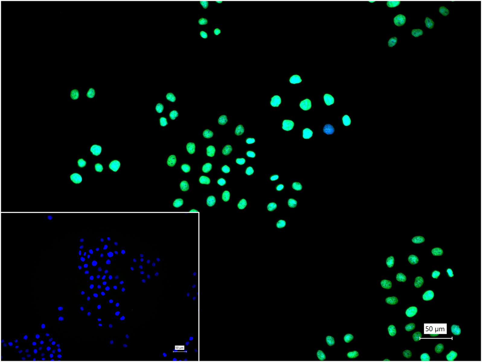 4% Paraformaldehyde-fixed HeLa (H) cell; Triton X-100 at r.t. for 20 min; Antibody incubation with (Mono-Methyl-Histone H3(K9)) monoclonal Antibody, unconjugated (bsm-63262R) 1:100, 90 min at 37°C; followed by BF488 conjugated Goat Anti-Rabbit IgG antibody (green, bs-60295G-BF488) at 37°C for 90 min, DAPI (blue, C02-04002) was used to stain the cell nuclei. PBS instead of the primary antibody was used as the blank control.