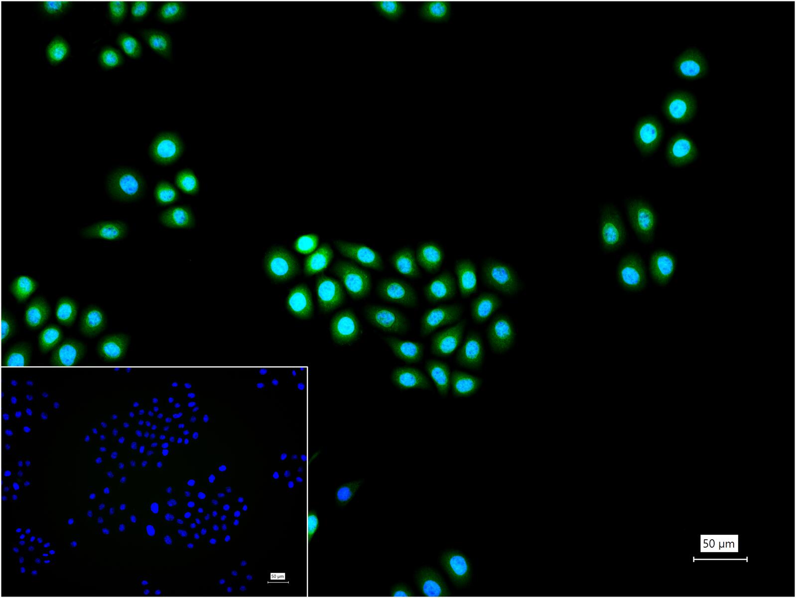 4% Paraformaldehyde-fixed HeLa (H) cell; Triton X-100 at r.t. for 20 min; Antibody incubation with (DiMethyl-Histone H3(K4)) monoclonal Antibody, unconjugated (bsm-63264R) 1:100, 90 min at 37°C; followed by BF488 conjugated Goat Anti-Rabbit IgG antibody (green, bs-60295G-BF488) at 37°C for 90 min, DAPI (blue, C02-04002) was used to stain the cell nuclei. PBS instead of the primary antibody was used as the blank control.