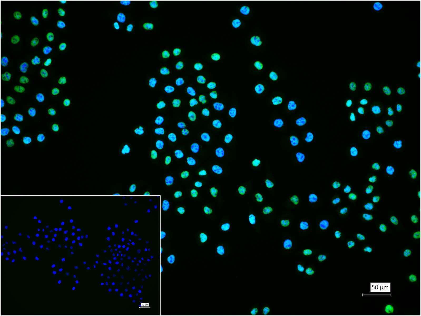 4% Paraformaldehyde-fixed HeLa (H) cell; Triton X-100 at r.t. for 20 min; Antibody incubation with (MCM2) monoclonal Antibody, unconjugated (bsm-63311R) 1:100, 90 min at 37°C; followed by conjugated Goat Anti-Rabbit IgG antibody (green, bs-60295G-BF488) at 37°C for 90 min, DAPI (blue, C02-04002) was used to stain the cell nuclei. PBS instead of the primary antibody was used as the blank control.