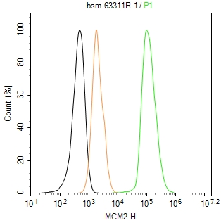The HeLa (H) cells were fixed with 4% PFA (10 min at r.t.) and then permeabilized with 90% ice-cold methanol for 20 min at -20℃,the cells then were incubated in 5%BSA to block non-specific protein-protein interactions (30 min at r.t.), followed by secondary antibody incubation for 40 min at room temperature. Primary Antibody (green):Rabbit Anti-MCM2 antibody (bsm-63311R,1:100); Isotype Control (orange): Rabbit IgG (bs-0295P). Blank control (black): PBS. Acquisition of 20,000 events was performed.