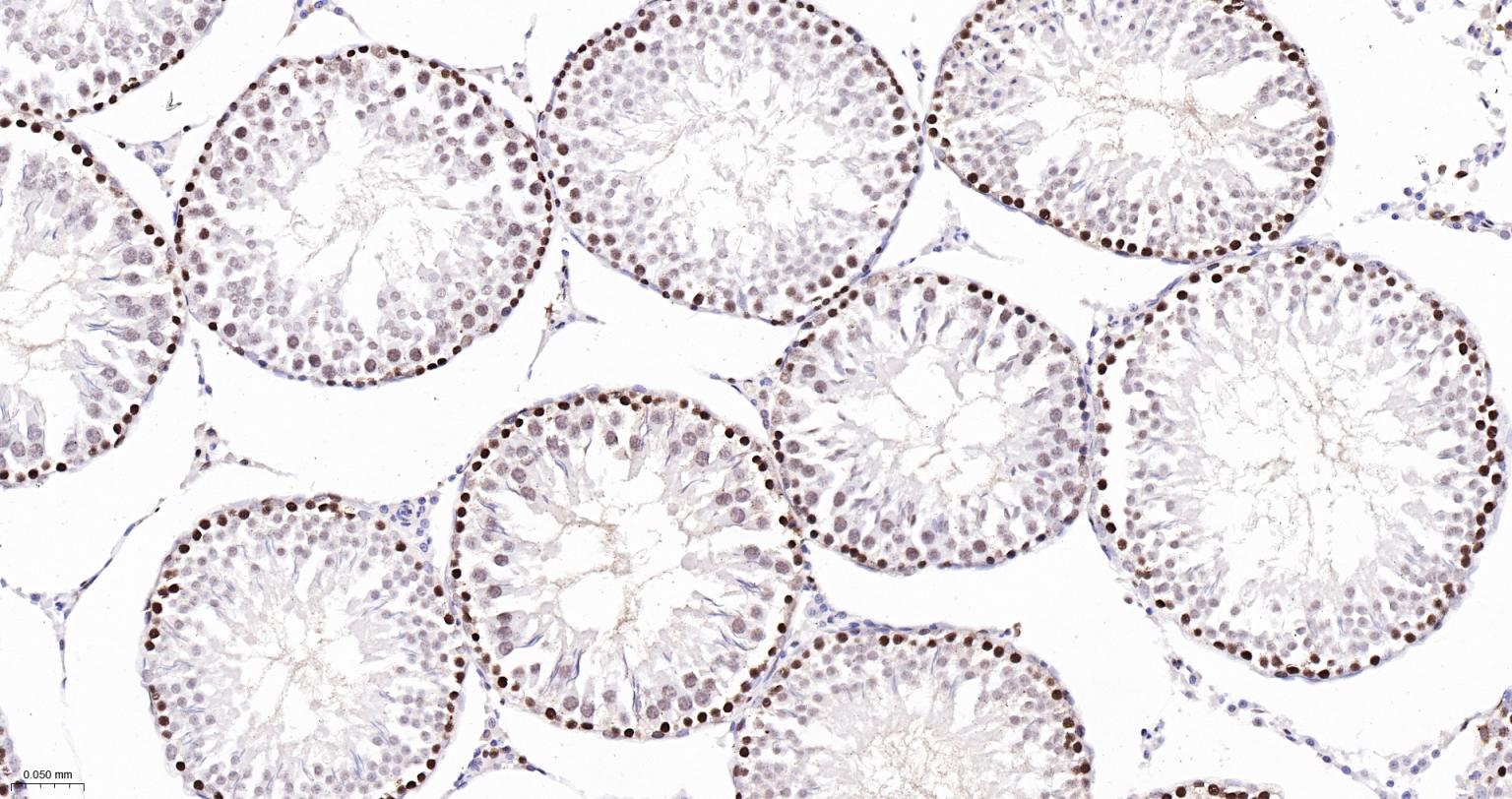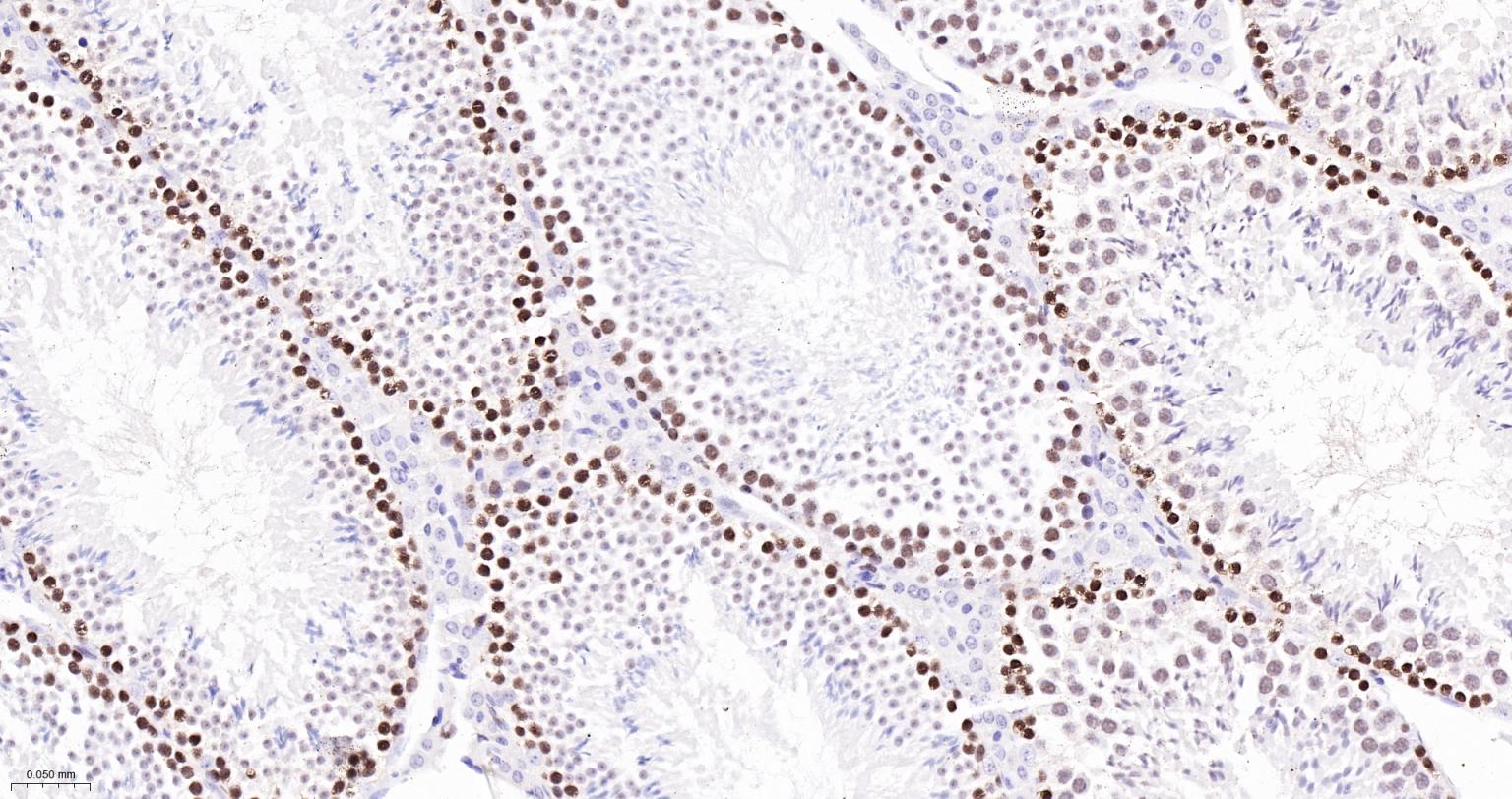 Paraformaldehyde-fixed, paraffin embedded Rat Testicles; Antigen retrieval by boiling in sodium citrate buffer (pH6.0) for 15 min; The section was incubated with MCM2 Monoclonal Antibody, Unconjugated (bsm-63311R) at 1:200 overnight at 4°C, followed by conjugation to the bs-0295G-HRP and DAB (C-0010) staining.