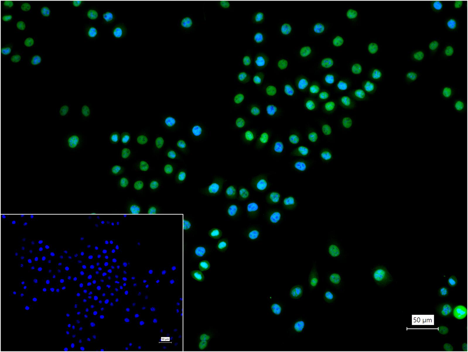 4% Paraformaldehyde-fixed HeLa (H) cell; Triton X-100 at r.t. for 20 min; Antibody incubation with (phospho-MCM2 (S27)) monoclonal Antibody, unconjugated (bsm-63312R) 1:100, 90 min at 37°C; followed by BF488 conjugated Goat Anti-Rabbit IgG antibody (green, bs-60295G-BF488) at 37°C for 90 min, DAPI (blue, C02-04002) was used to stain the cell nuclei. PBS instead of the primary antibody was used as the blank control.