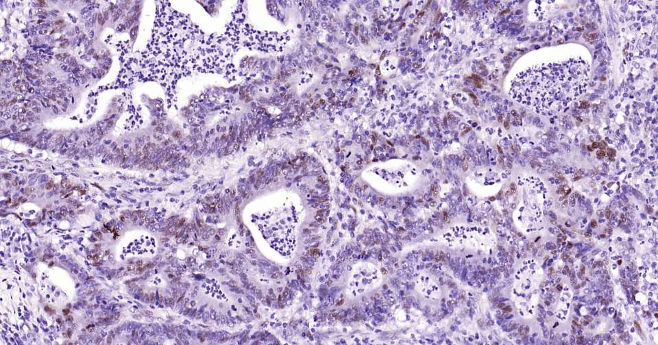 Immunohistochemical analysis of paraffin embedded human colon cancer tissue slide using IHC0325 (Cyclin D1 Kit).