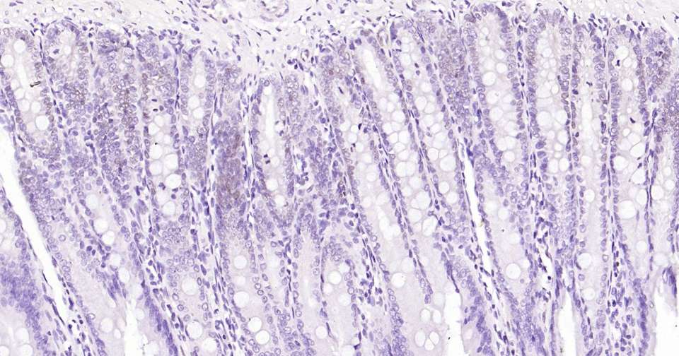 Immunohistochemical analysis of paraffin embedded mouse small intestine tissue slide using IHC0325 (Cyclin D1 Kit).
