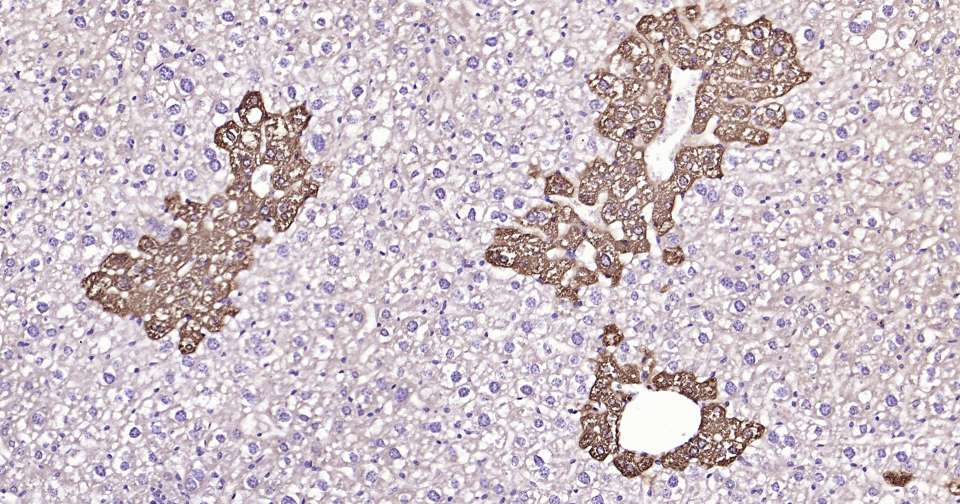 Immunohistochemical analysis of paraffin embedded human liver tissue slide using IHC0333 (Glutamine synthetase Kit).