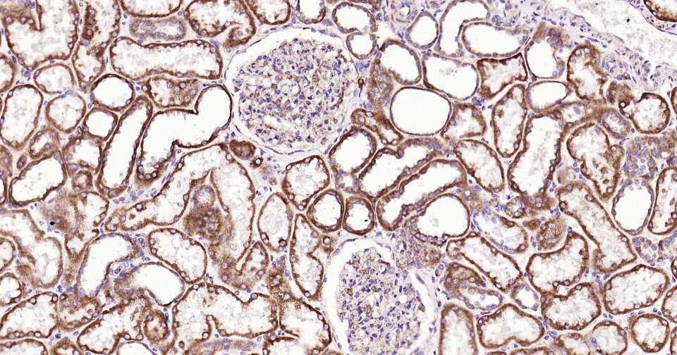 Immunohistochemical analysis of paraffin embedded human kidney tissue slide using IHC0340H (Human Shh Kit).