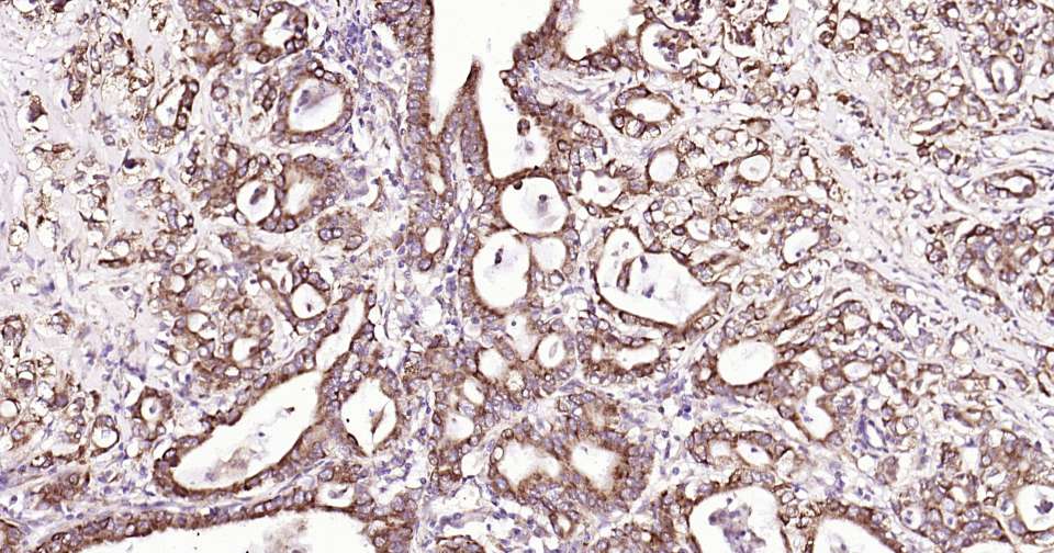 Immunohistochemical analysis of paraffin embedded human pancreatic cancer tissue slide using IHC0340H (Human Shh Kit).