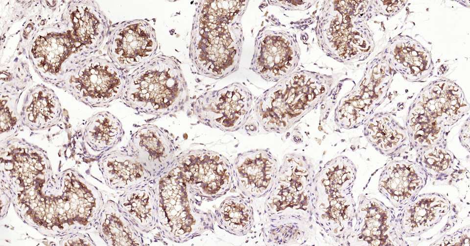 Immunohistochemical analysis of paraffin embedded human testis tissue slide using IHC0341 (Hsp90 alpha Kit).