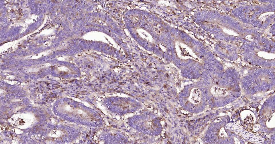 Immunohistochemical analysis of paraffin embedded human colon cancer tissue slide using IHC0342H (Human AACT Kit).
