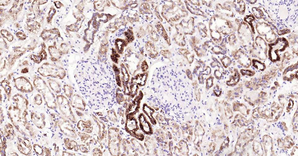 Immunohistochemical analysis of paraffin embedded human kidney tissue slide using IHC0343H (Human Osteopontin Kit).