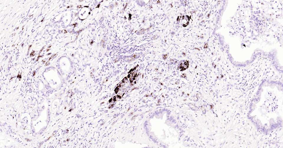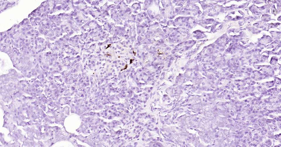 Immunohistochemical analysis of paraffin embedded human pancreas tissue slide using IHC0343H (Human Osteopontin Kit).