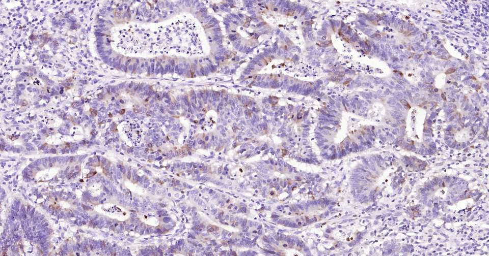Immunohistochemical analysis of paraffin embedded human colon cancer tissue slide using IHC0344 (Phospho-CDK1/2 (Thr14) Kit).