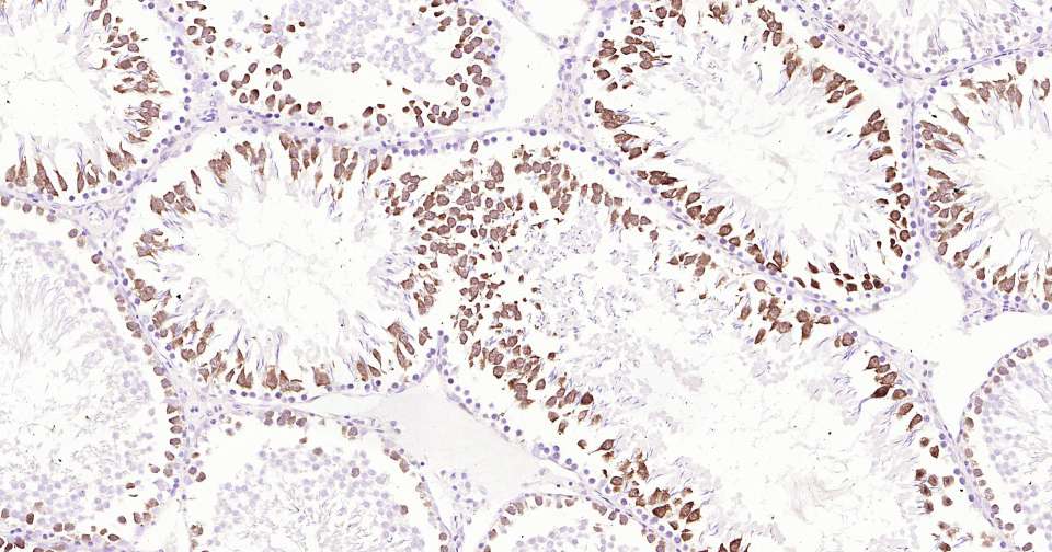 Immunohistochemical analysis of paraffin embedded mouse testis tissue slide using IHC0344 (Phospho-CDK1/2 (Thr14) Kit).