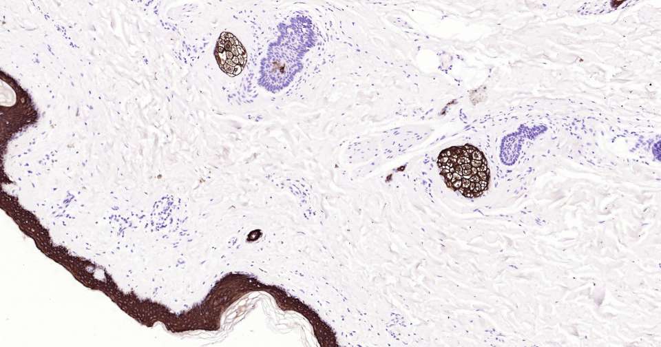 Immunohistochemical analysis of paraffin embedded human skin tissue slide using IHC0360 (CK10/Cytokeratin 10 Kit).