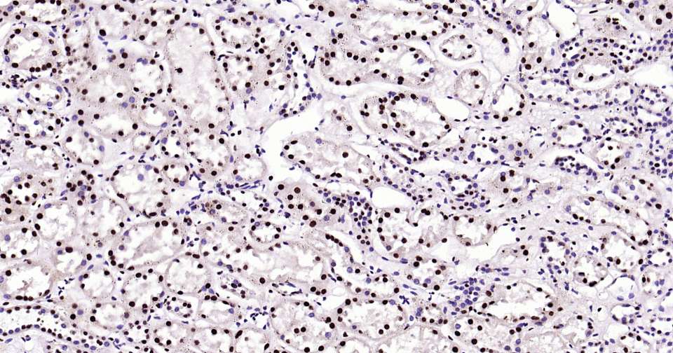 Immunohistochemical analysis of paraffin embedded human kidney tissue slide using IHC0368H (Human HES5 Kit).