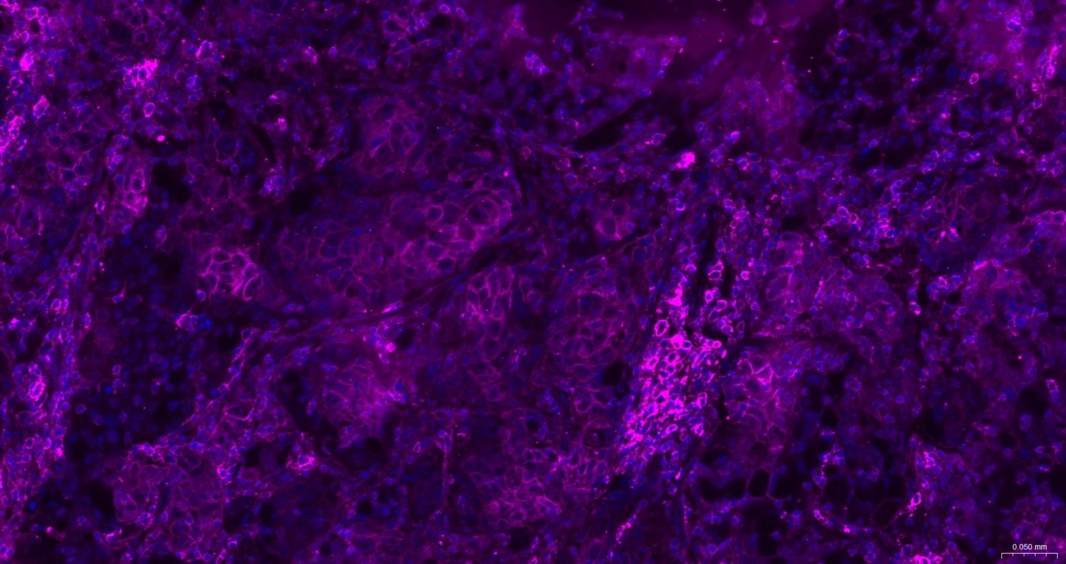 Paraformaldehyde-fixed, paraffin embedded Human Esophageal Cancer; Antigen retrieval by boiling in sodium citrate buffer (pH6.0) for 15 min; Incubation: CD44 Antibody, conjugated (bsm-54767R-BF647) at 1:200 overnight at 4°C; DAPI (blue, C02-04002) was used to stain the cell nuclei.