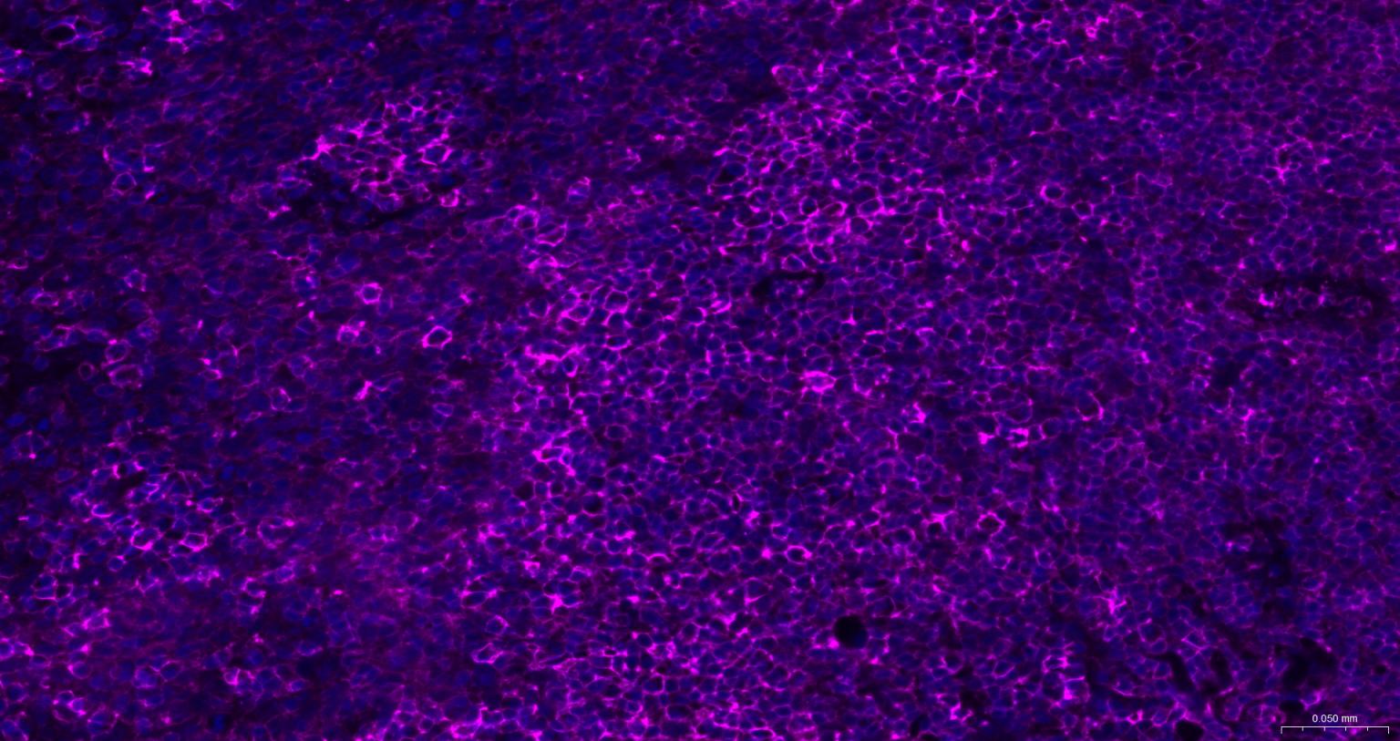 Paraformaldehyde-fixed, paraffin embedded Human Spleen; Antigen retrieval by boiling in sodium citrate buffer (pH6.0) for 15 min; Incubation: CD44 Antibody, conjugated (bsm-54767R-BF647) at 1:200 overnight at 4°C; DAPI (blue, C02-04002) was used to stain the cell nuclei.