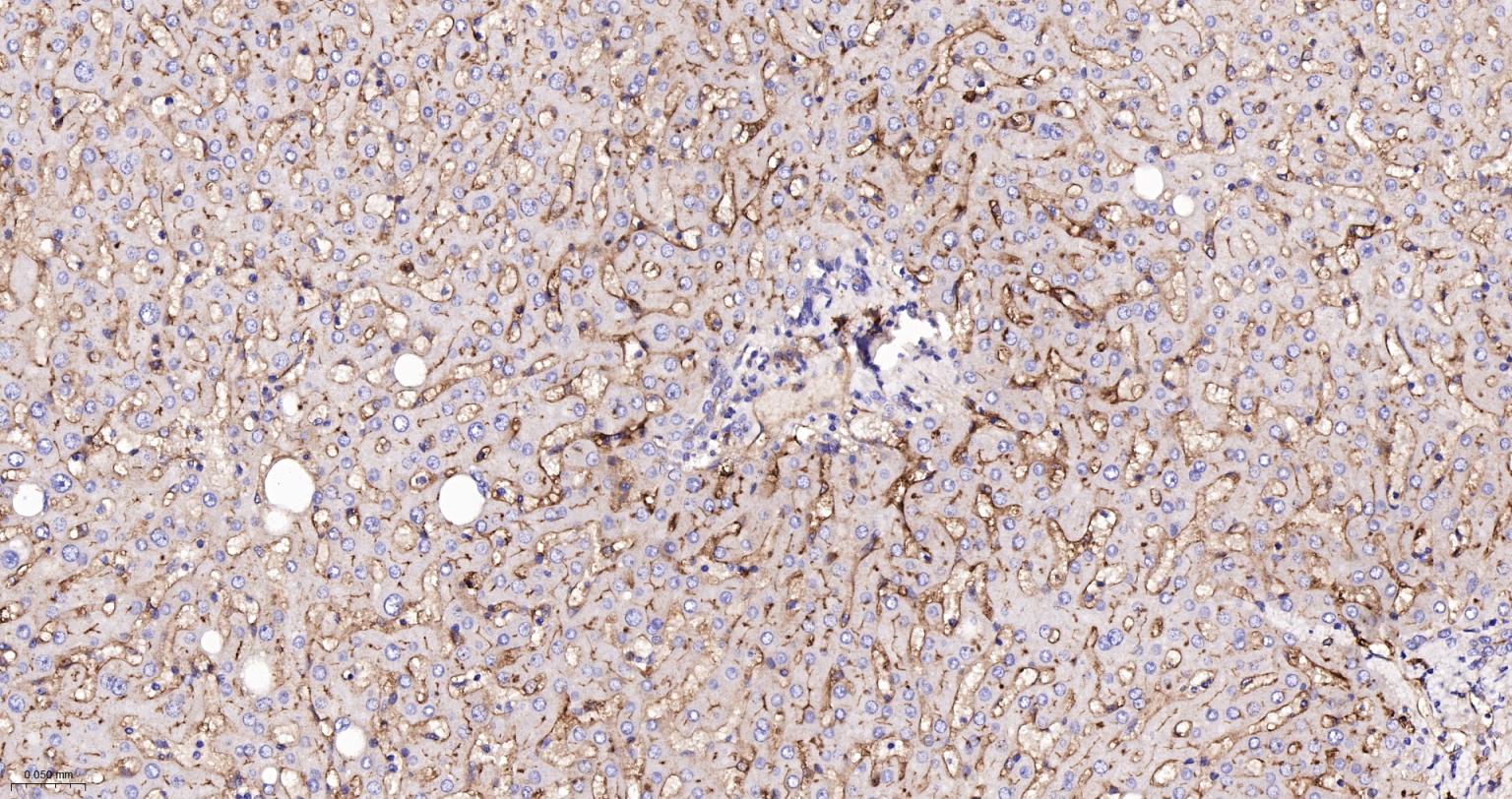 Paraformaldehyde-fixed, paraffin embedded Human Liver; Antigen retrieval by boiling in sodium citrate buffer (pH6.0) for 15 min; Antibody incubation with CD73 Monoclonal Antibody, Unconjugated(bsm-52916R) at 1:200 overnight at 4°C, followed by conjugation to the SP Kit (Rabbit, SP-0023) and DAB (C-0010) staining.