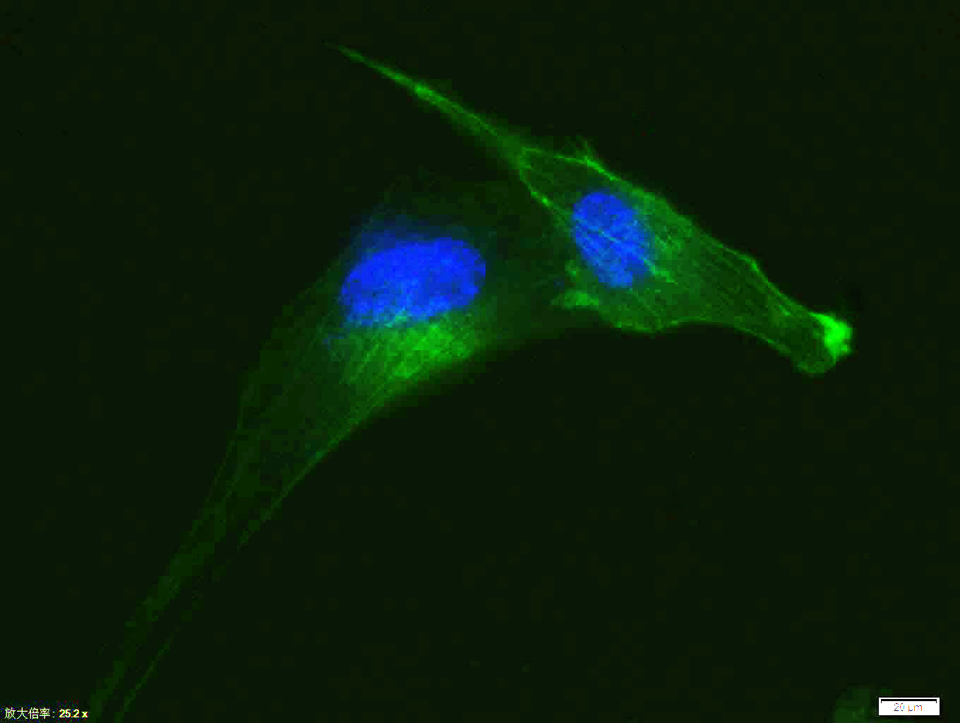 Tissue/cell:U-87mg cell; 4% Paraformaldehyde-fixed; Triton X-100 at room temperature for 20 min; Blocking buffer (normal goat serum, C-0005) at 37°C for 20 min; Antibody incubation with (alpha smooth muscle Actin) monoclonal Antibody, Unconjugated (bsm-52392R) 1:100, 90 minutes at 37°C; followed by a FITC conjugated Goat Anti-Rabbit IgG antibody at 37°C for 90 minutes, DAPI (blue, C02-04002) was used to stain the cell nuclei.