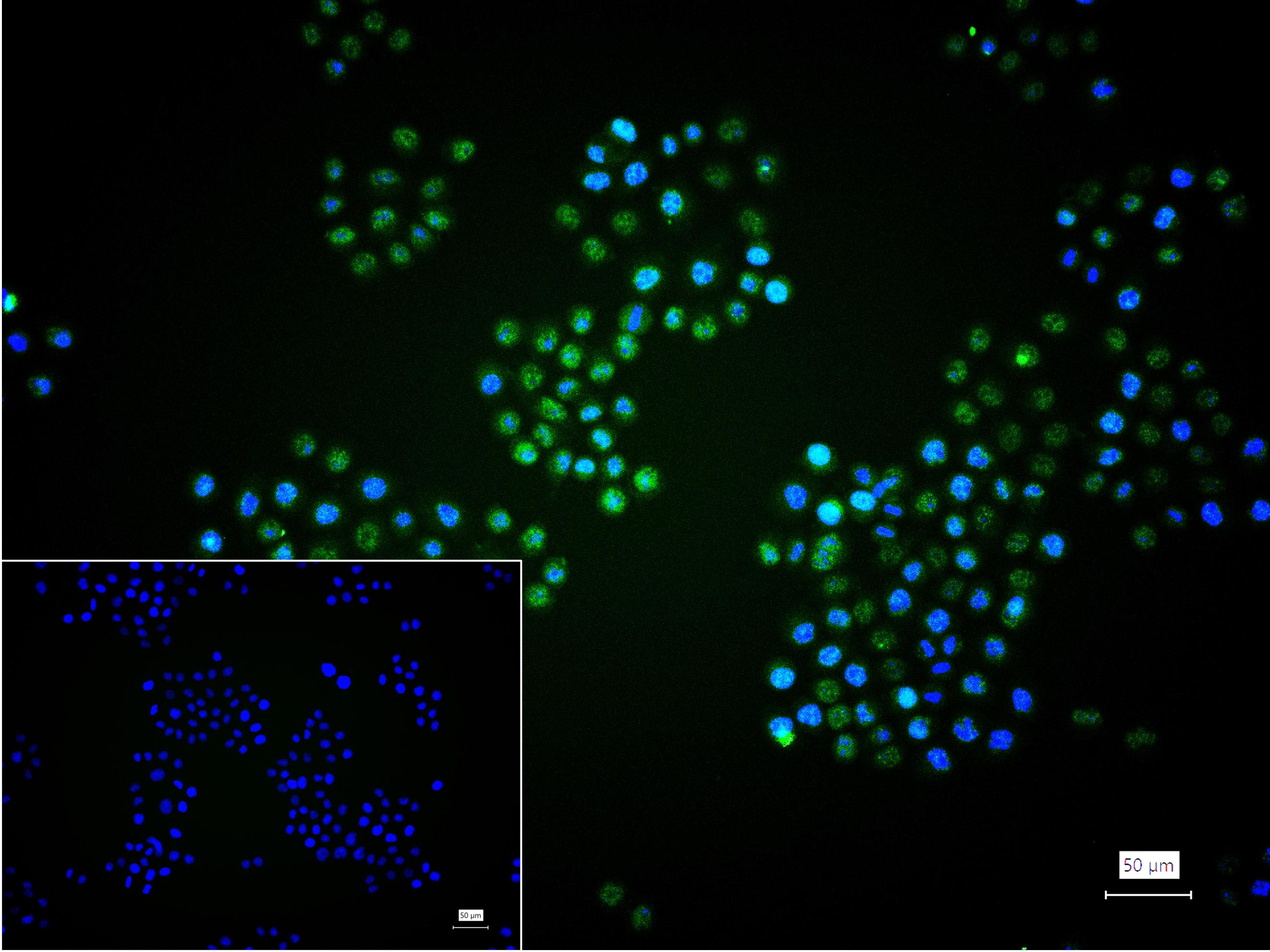 4% Paraformaldehyde-fixed Hela (tunicamycin-treated (2μg/ml, 8h)) (H) cell; Triton X-100 at r.t. for 20 min; Antibody incubation with (ATF4) monoclonal Antibody, unconjugated (bsm-52667R) 1:100, 90 min at 37°C; followed by conjugated Goat Anti-Rabbit IgG antibody (green, bs-60295G-BF488) at 37°C for 90 min, DAPI (blue, C02-04002) was used to stain the cell nuclei. PBS instead of the primary antibody was used as the blank control.
