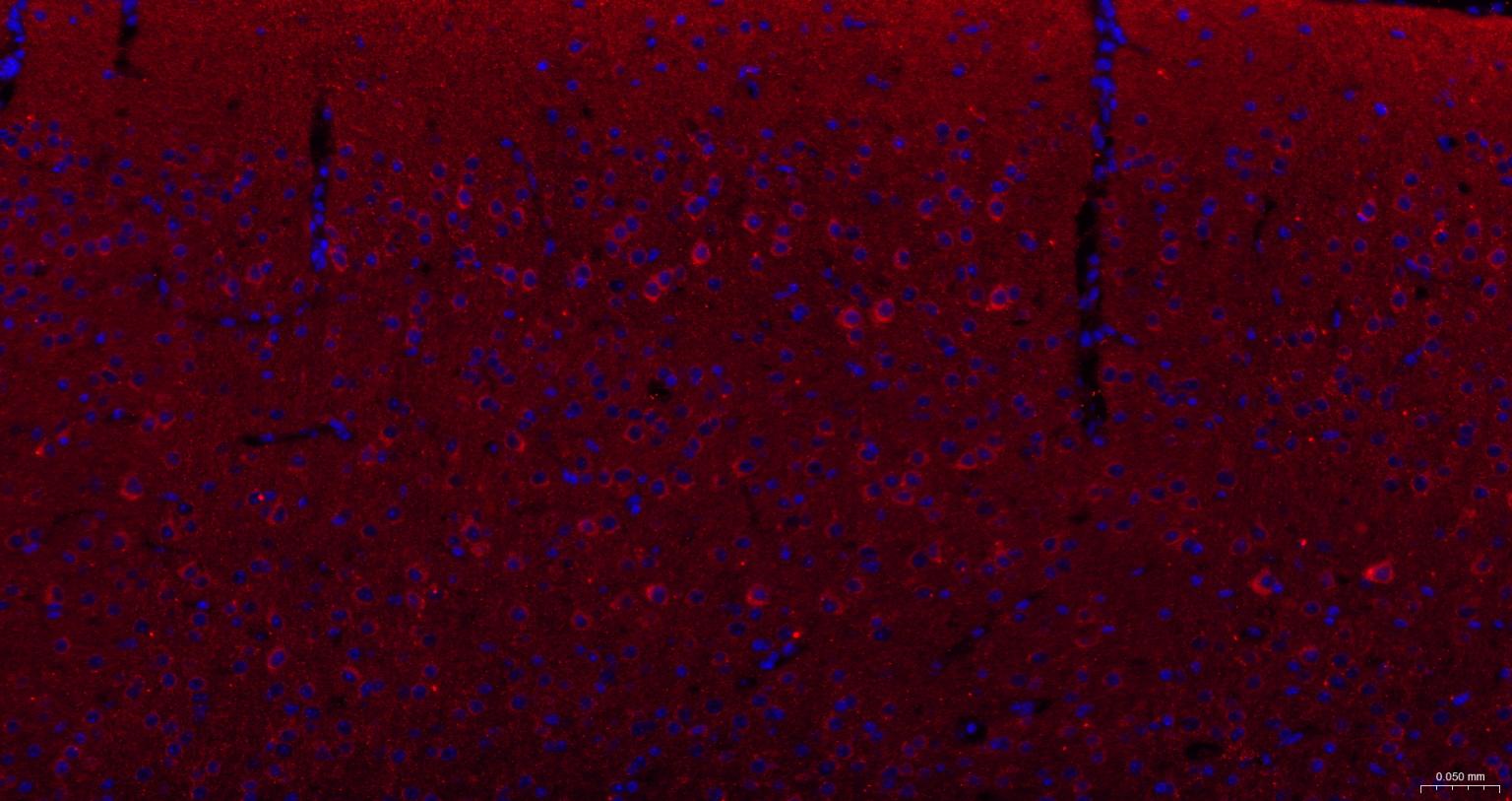 Paraformaldehyde-fixed, paraffin embedded Rat Cerebrum; Antigen retrieval by boiling in sodium citrate buffer (pH6.0) for 15 min; The section was incubated with SQSTM1/p62 Monoclonal Antibody, Unconjugated (bs-55207R) at 1:200 overnight at 4°C. Followed by conjugated Goat Anti-Rabbit IgG antibody (Red, bs-0295G-BF594), DAPI (blue, C02-04002) was used to stain the cell nuclei.