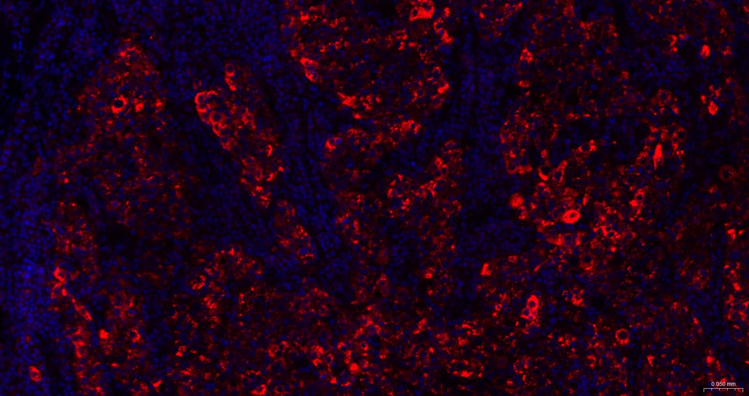 Paraformaldehyde-fixed, paraffin embedded Human Gastric Cancer; Antigen retrieval by boiling in sodium citrate buffer (pH6.0) for 15 min; The section was incubated with SQSTM1/p62 Monoclonal Antibody, Unconjugated (bs-55207R) at 1:200 overnight at 4°C. Followed by conjugated Goat Anti-Rabbit IgG antibody (Red, bs-0295G-BF594), DAPI (blue, C02-04002) was used to stain the cell nuclei.