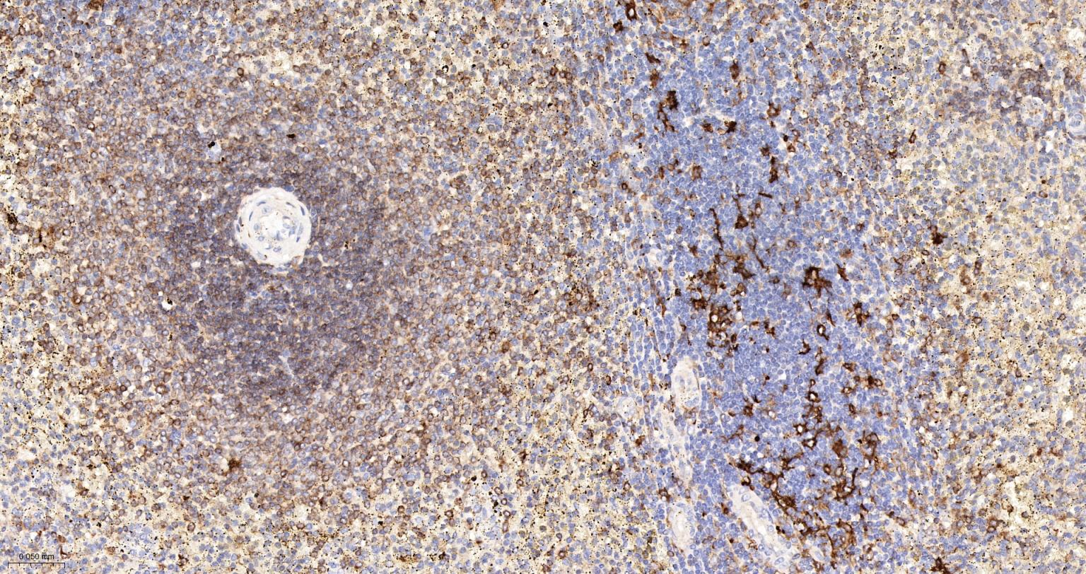 Paraformaldehyde-fixed, paraffin embedded Human Spleen; Antigen retrieval by boiling in sodium citrate buffer (pH6.0) for 15 min; The section was incubated with Human IgM Monoclonal Antibody, Unconjugated (bsm-52860R) at 1:200 overnight at 4°C, followed by conjugation to the bs-0295G-HRP and DAB (C-0010) staining.