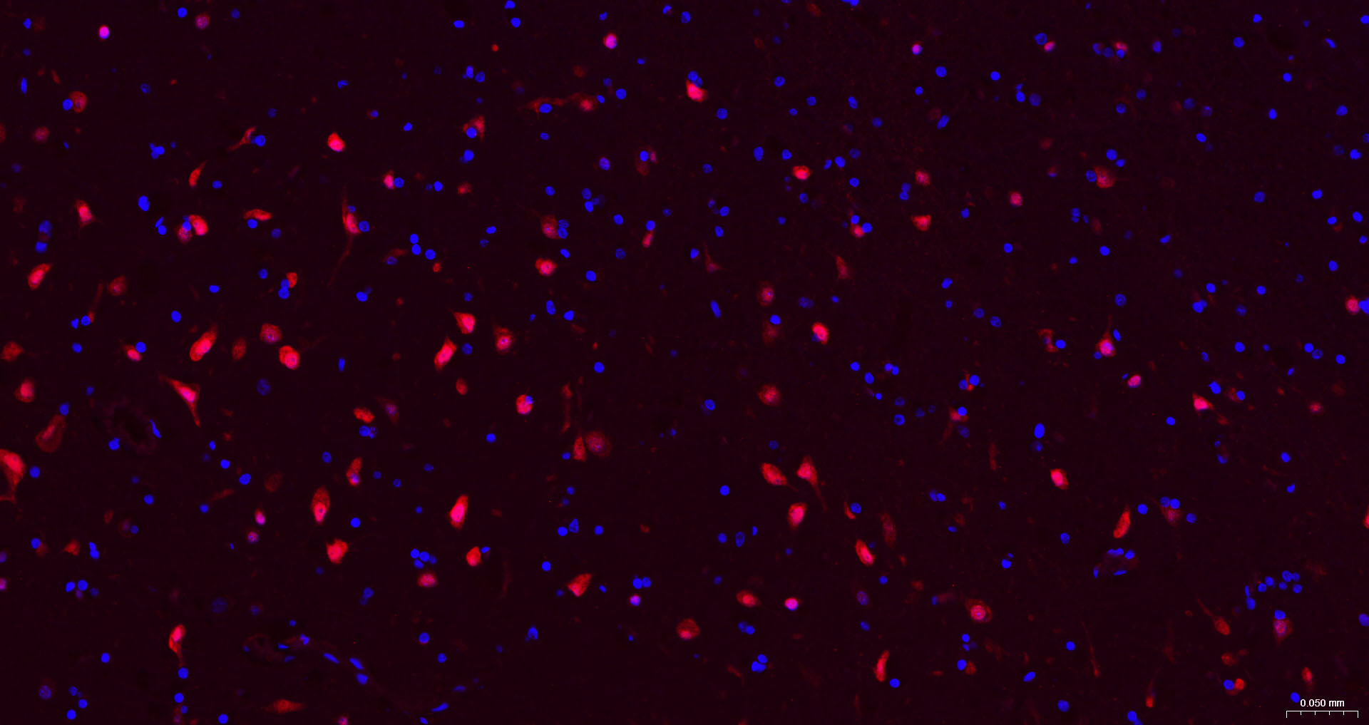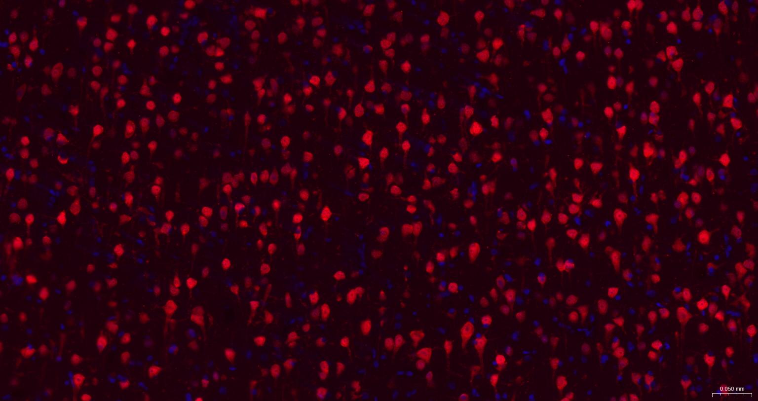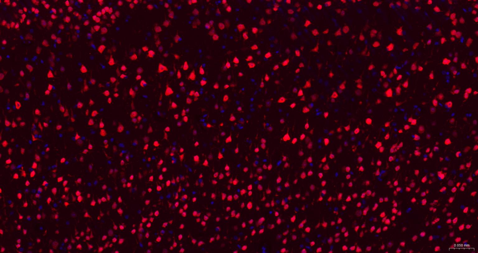 Paraformaldehyde-fixed, paraffin embedded Rat Cerebrum; Antigen retrieval by boiling in sodium citrate buffer (pH6.0) for 15 min; The section was incubated with NeuN Monoclonal Antibody, Unconjugated (bsm-52268R) at 1:200 overnight at 4°C. Followed by conjugated Goat Anti-Rabbit IgG antibody (Red, bs-0295G-BF594), DAPI (blue, C02-04002) was used to stain the cell nuclei.