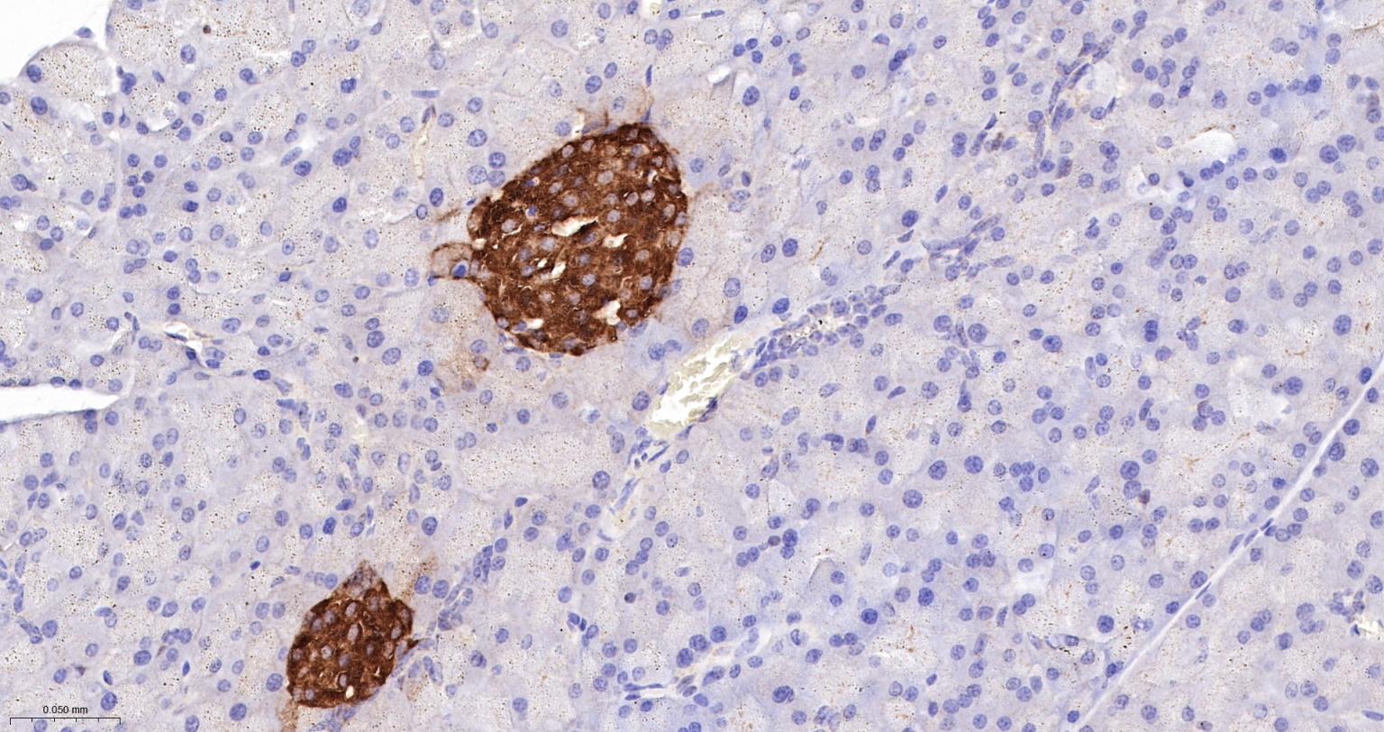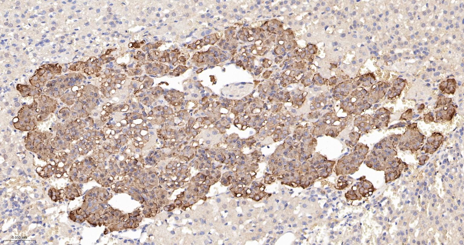 Paraformaldehyde-fixed, paraffin embedded Rat Pancreas; Antigen retrieval by boiling in sodium citrate buffer (pH6.0) for 15 min; Antibody incubation with PTEN Monoclonal Antibody, Unconjugated(bsm-52369R) at 1:200 overnight at 4°C, followed by conjugation to the bs-0295G-HRP and DAB (C-0010) staining.