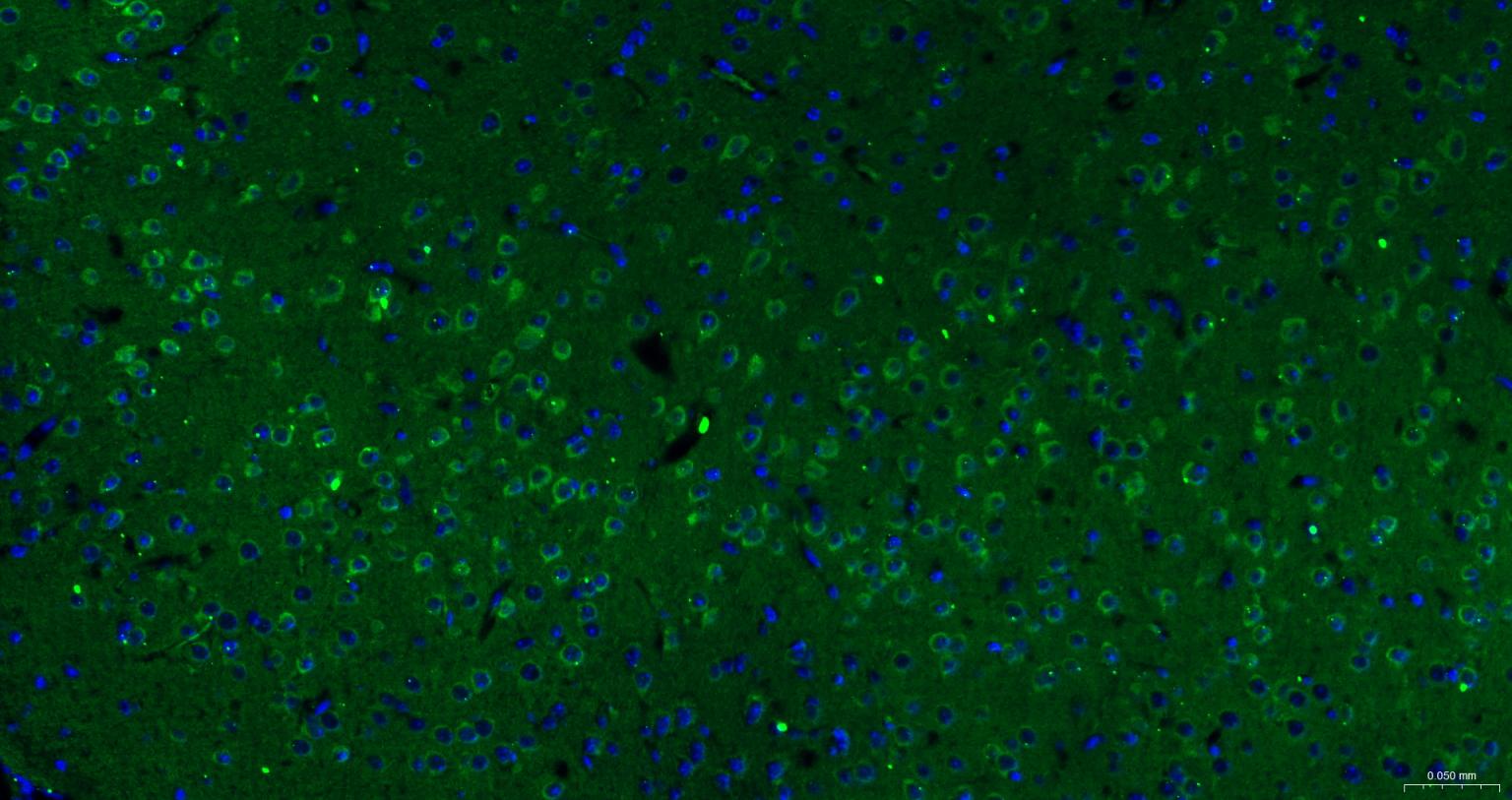Paraformaldehyde-fixed, paraffin embedded Mouse Cerebrum; Antigen retrieval by boiling in sodium citrate buffer (pH6.0) for 15 min; The section was incubated with PTEN Monoclonal Antibody, Unconjugated (bsm-52369R) at 1:200 overnight at 4°C. Followed by conjugated Goat Anti-Rabbit IgG antibody (Green, bs-0295G-BF488), DAPI (blue, C02-04002) was used to stain the cell nuclei.