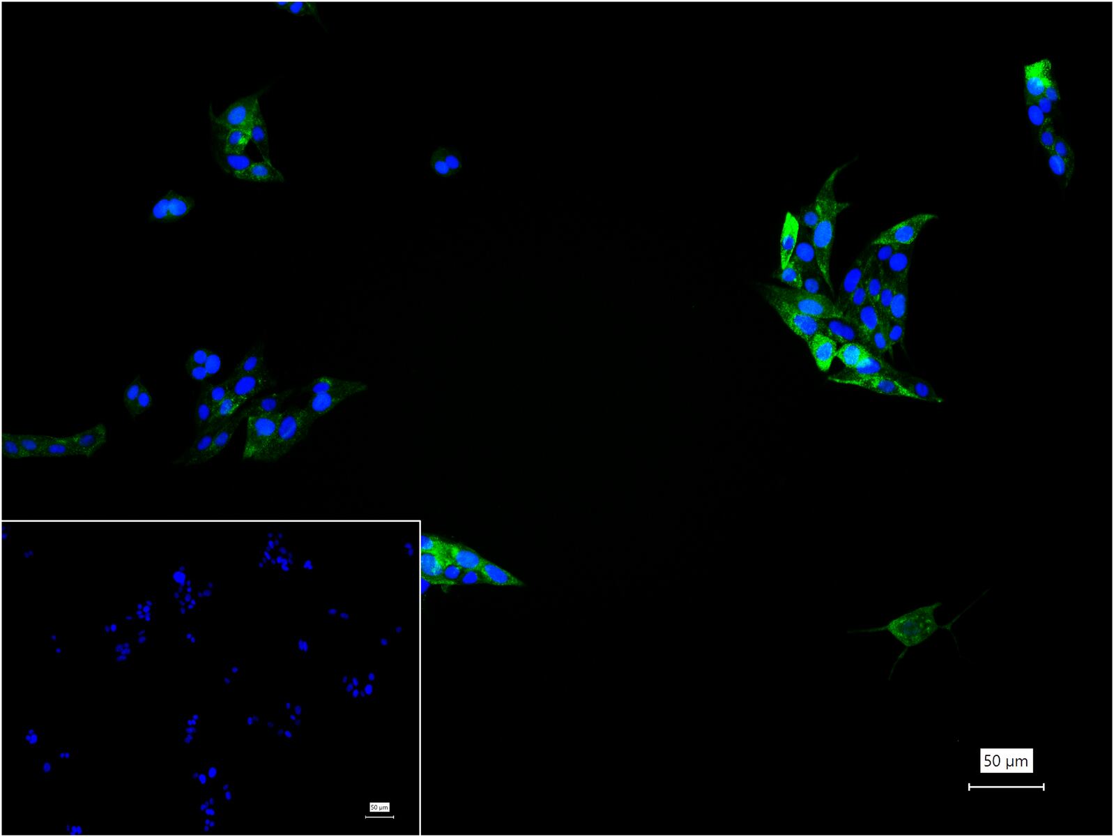 4% Paraformaldehyde-fixed TT (treated with BFA) (H) cell; Triton X-100 at r.t. for 20 min; Antibody incubation with (Procalcitonin(PCT)) monoclonal Antibody, unconjugated (bsm-41284M) 1:100, 90 min at 37°C; followed by FITC conjugated Goat Anti-Mouse IgG antibody (green, bs-60296G-FITC) at 37°C for 90 min, DAPI (blue, C02-04002) was used to stain the cell nuclei. PBS instead of the primary antibody was used as the blank control.