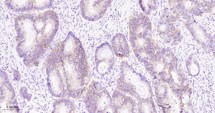 Paraformaldehyde-fixed, paraffin embedded Human Colon Cancer; Antigen retrieval by boiling in sodium citrate buffer (pH6.0) for 15 min; Antibody incubation with CLDN1 Monoclonal Antibody, Unconjugated(bsm-52037M) at 1:200 overnight at 4°C, followed by conjugation to the bs-40296G-HRP and DAB (C-0010) staining.