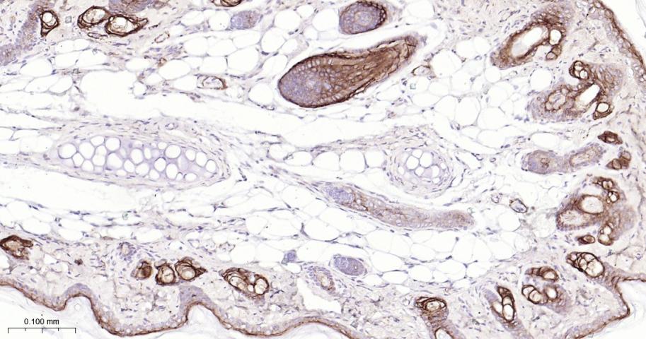 Paraformaldehyde-fixed, paraffin embedded Mouse Skin; Antigen retrieval by boiling in sodium citrate buffer (pH6.0) for 15 min; Antibody incubation with CLDN1 Monoclonal Antibody, Unconjugated(bsm-52037M) at 1:200 overnight at 4°C, followed by conjugation to the bs-40296G-HRP and DAB (C-0010) staining.