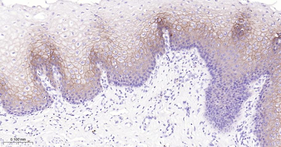 Paraformaldehyde-fixed, paraffin embedded Human Esophagus; Antigen retrieval by boiling in sodium citrate buffer (pH6.0) for 15 min; Antibody incubation with CLDN1 Monoclonal Antibody, Unconjugated(bsm-52037M) at 1:200 overnight at 4°C, followed by conjugation to the bs-40296G-HRP and DAB (C-0010) staining.